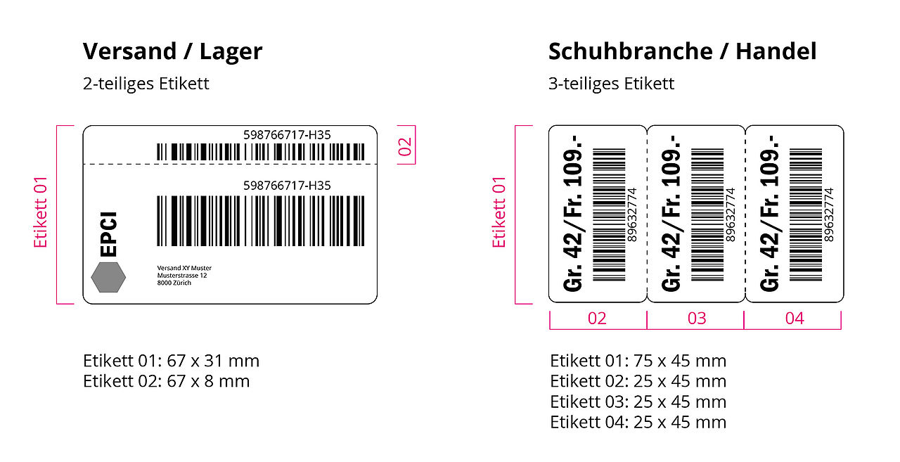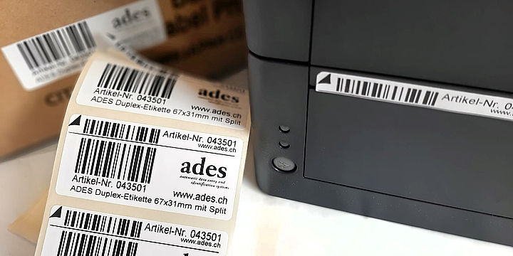 Grundsätzlich gibt es zwei verschiedene Möglichkeiten, um Duplex-Etiketten zu drucken. Für schwarz/weisse Etiketten verwenden Sie einen Thermotransferdrucker und für farbige Etiketten einen Inkjet-Drucker. Für die Beschriftung im Lager, Versand, Verkauf oder überall dort, wo organisatorische Abläufe vereinfacht werden sollen, empfehlen wir unsere Thermotransfer Rollen. Diese sind entweder mit einem zusätzlichen Split oder gleich als 3-teilige Etiketten erhältlich. So können Sie Ihre Produkte (z.B. Schuhe und Schuhkarton) auf einfachste Weise kennzeichnen.
