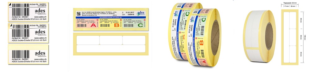 ADES Thermotransfer Duplex-Etiketten werden auf Rollen geliefert und sind in verschiedenen Formaten und mit unterschiedlich vielen Splits erhältlich: 2- und 3-teilige Etiketten.