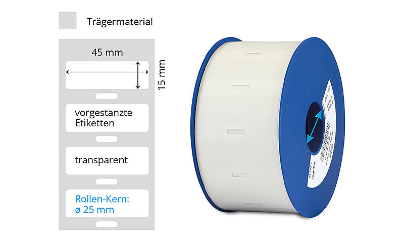 | 45 x 15 mm | Transparent | Permanent | 1'250 | LM Vinyl | ø 25 mm | ohne Perforation | 042115 | ||