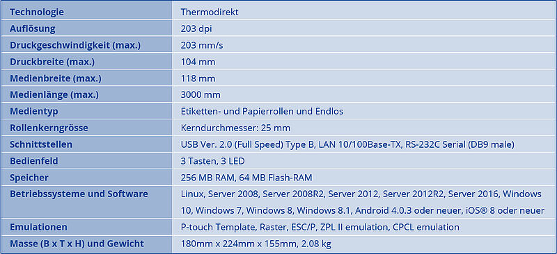 Mit seiner geringen Standfläche fügt sich das Modell in die kleinsten Zwischenräume am Arbeitsplatz ein und beansprucht kaum Platz. Damit sind Sie in der Lage Etiketten mit einer Breite von bis zu 118 mm zu bedrucken und das alles in einer passablen Geschwindigkeit von bis zu 203mm/s.