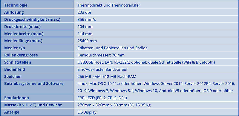 Die Einbindung des Druckers gelingt über eine USB, USB-Host, Seriell oder LAN-Schnittstelle. Eine optionale duale Wireless-Schnittstelle (WiFi und Bluetooth) ist möglich. Darüber hinaus unterstützt er die Druckersprachen FBPL-EZD (EPL2, ZPL2, DPL) und bietet hohe Speicherkapazität sowie mehrere Verbindungsfunktionen, die eine problemlose Druckereinrichtung gewährleisten.