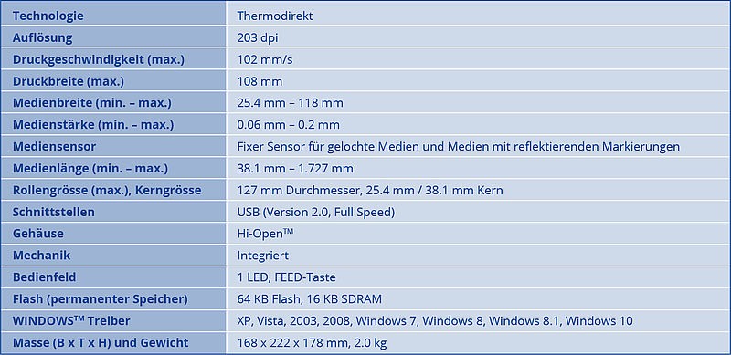 Der Drucker verfügt über eine Full-Speed USB 2.0 Schnittstelle und ist dadurch sofort einsatzbereit. Dank dem eingebauten Stromanschluss benötigt er nur einen geringen Platzbedarf und ist durch das erhöhte Eigengewicht sehr stabil.