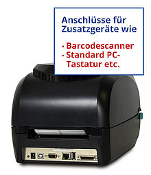 Optional ist für dieses Modell ein Etikettenspender, eine Schneide-Vorrichtung, ein externer Etikettenaufwickler sowie Rollenhalter erhältlich.
