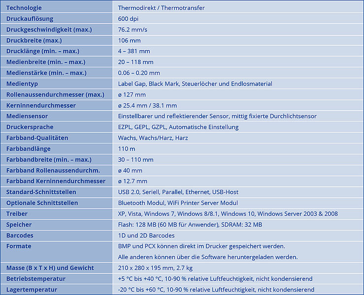 Mit diesem Modell können Sie individuelle Etiketten mit einer Breite von 20 bis 118 mm und einer Auflösung von 600 dpi bedrucken. Alle Etiketten, auch solche mit Label-Gap, Black Mark, Steuerlöcher sowie Endlosmaterial.
