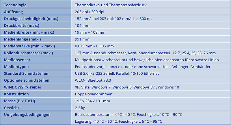 Der Zebra ZD631R kann Thermodirekt- und Thermotransfer-Medien bedrucken. Die Breite darf von 15 mm bis hin zu 118 mm variieren und eine Länge von 6.4 bis 991 mm haben.