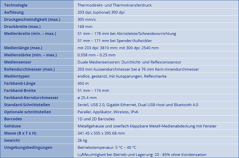 Thermotransfer-Drucker 300 dpi mit Ethernet, USB, USB Host, Bluetooth 4.0 und Seriell Schnittstelle