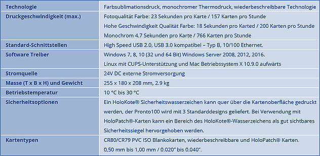 Kartenkapazität von je 50 Karten für Zufuhr und Auffangschale. Kompatibel mit Windows 7, 8, 10 (32 und 64 Bit) Windows Server 2008, 2012, 2016. Linux mit CUPS-Unterstützung und Mac X 10.9.0 aufwärts.