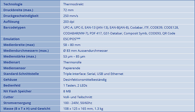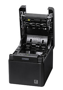 Der CT-E301 bietet mehrere Anschlussmöglichkeiten (USB oder dreifachem USB-, seriellem und Ethernet-Anschluss) sowie einen Anschluss für eine Kassenschublade. Darüber hinaus können Sie beim Citizen CT-E301 die Papierbreite selbst einstellen 57,5 - 79,5 (+/- 0,5 mm). Der schnelle Belegdruck von 250 mm pro Sekunde, der schnelle und leise Papierabschnitt (Voll-/Teilschnitt) sowie die Kassenfachausgabe machen ihn zum Topmodell.