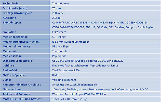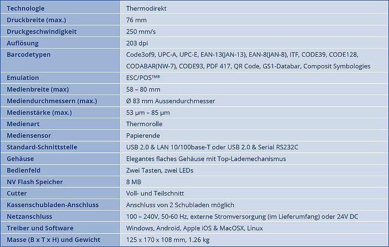 Die Bedienung, vor allem das Nachfüllen der Medienrolle, gestaltet sich dank Drop-in Stystem sehr eifach, sodass das Modell auch für ungeübte Nutzer geeignet ist. Dank seinen vielseitigen Features kann der Drucker überall eingesetzt werden, arbeitet sehr effizient, verhindert Papierstaus und verringert so die Wartezeit für Ihre Kunden an der Kasse.