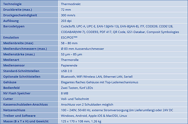 Die Bedienung, vor allem das Nachfüllen der Medienrolle gestaltet sich dank Drop-in Stystem sehr eifach, sodass das Modell auch für ungeübte Nutzer geeignet ist. Dank seinen vielseitigen Features kann der Drucker überall eingesetzt werden, arbeitet sehr effizient, verhindert Papierstaus und verringert so die Wartezeit für Ihre Kunden an der Kasse.