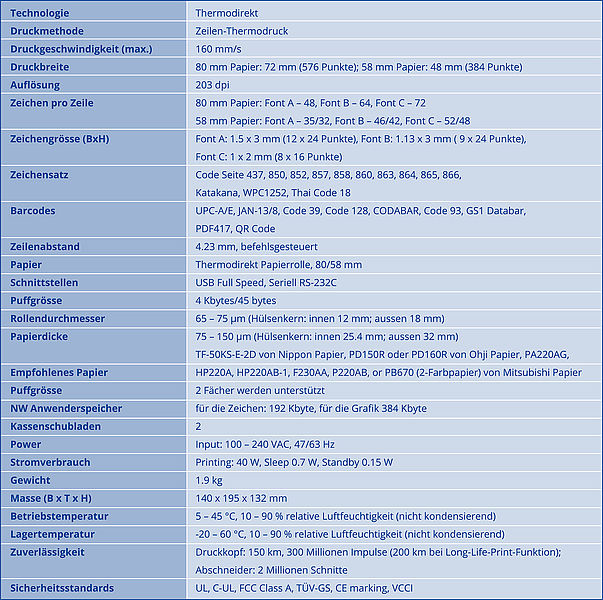 Zudem können Sie beim Citizen CT-S310II die Papierbreite selbst einstellen (80 mm oder 57 mm). Auch die hohe Druckgeschwindigkeit von 160 mm pro Sekunde, der schnelle und leise Papierabschnitt (Voll-/Teilschnitt) sowie die Kassenfachausgabe macht ihn zum Topmodell.