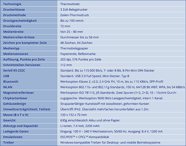 Der mobile Drucker verfügt standardmässig über eine serielle und USB Schnittstelle. Optional erhältlich sind: Bluetooth, WLAN