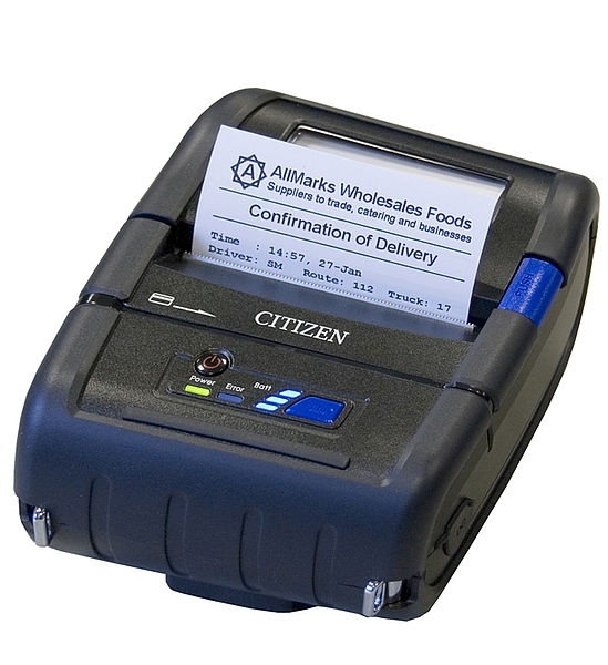 Der Citizen CMP-30II Drucker ist sehr leicht und kompakt gebaut, überzeugt aber mit Robustheit. Das Modell wurde so konzipiert, dass es problemlos den ganzen Tag getragen werden kann. Entweder am Gürtel mit der Gürtelschnalle oder mit dem Schultergürtel. Sie können damit ganz bequem unterwegs Belege und Etiketten mit einer Breite von 25 bis 80 mm drucken.