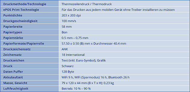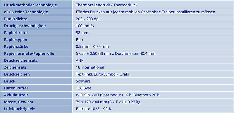 Der Epson TM-P20II ist sehr kompakt und ultraleicht, perfekt für alle, die einen zuverlässigen mobilen Drucker benötigen. Dank seiner schnellen Druckgeschwindigkeit von bis zu 100 mm pro Sekunde und einer Akkulaufzeit von bis zu acht Stunden ist er der ideale Begleiter im Einzelhandel, der Gastronomie und Transportbranche. Einkäufe und Bestellungen können damit schnell und flexibel abgewickelt werden, ein reibungsloser Betrieb ist garantiert. Die einfache Bedienung und die LED-Anzeige machen das Arbeiten unkompliziert und mittels Drop-in-Funktion lassen sich Papierrollen ebenfalls schnell und einfach nachlegen.