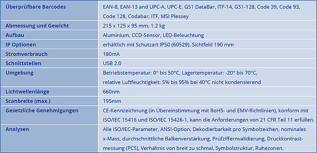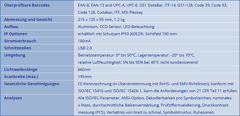 Der Strichcode Prüfer ist geeignet für alle linearen Barcodes mit einer maximalen Breite von 195 mm. Speziell konzipiert für die Prüfung von 1D-Codes im Logistik-, Transport- und Industriebereich. Dieses Gerät verfügt über einen Continious-Scan-Mode. Die S-Range Linie ermöglicht ein Scroll-Down ganzer Serien von Codes mit 100 Lesungen pro Sekunde für einen Code. Das Prüfgerät wird in einem Tragkoffer angeliefert inkl. Axicon Prüfgerät Software, USB-Datenkabel, Quick Start Guide, Kalibrierungs-Set und Compliance Zertifikate.
