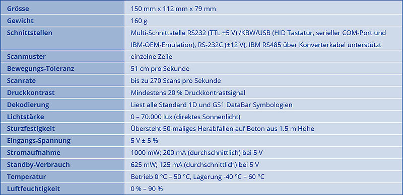 Bei 270 Scans pro Sekunde liest der ScanBar 1300g alle 1D- aber auch GS1 und DataBar-Codes. Durch die integrierte Imager-Technologie wird auf bewegliche Komponenten verzichtet. Diese sind auf ein Minimum reduziert, damit eine besonders robuste Bauweise gewährleistet werden kann. Selbst mehrfache Stürze auf Beton übersteht der Scanner dank IP41-Klassifizierung problemlos.